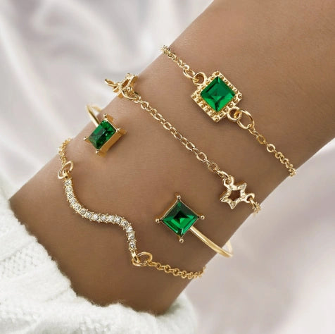 Направете всеки жест незабравим с нашия 4-частен комплект гривни с изумрудени кристали и злато – впечатляваща комбинация от елегантност, блясък и стил.